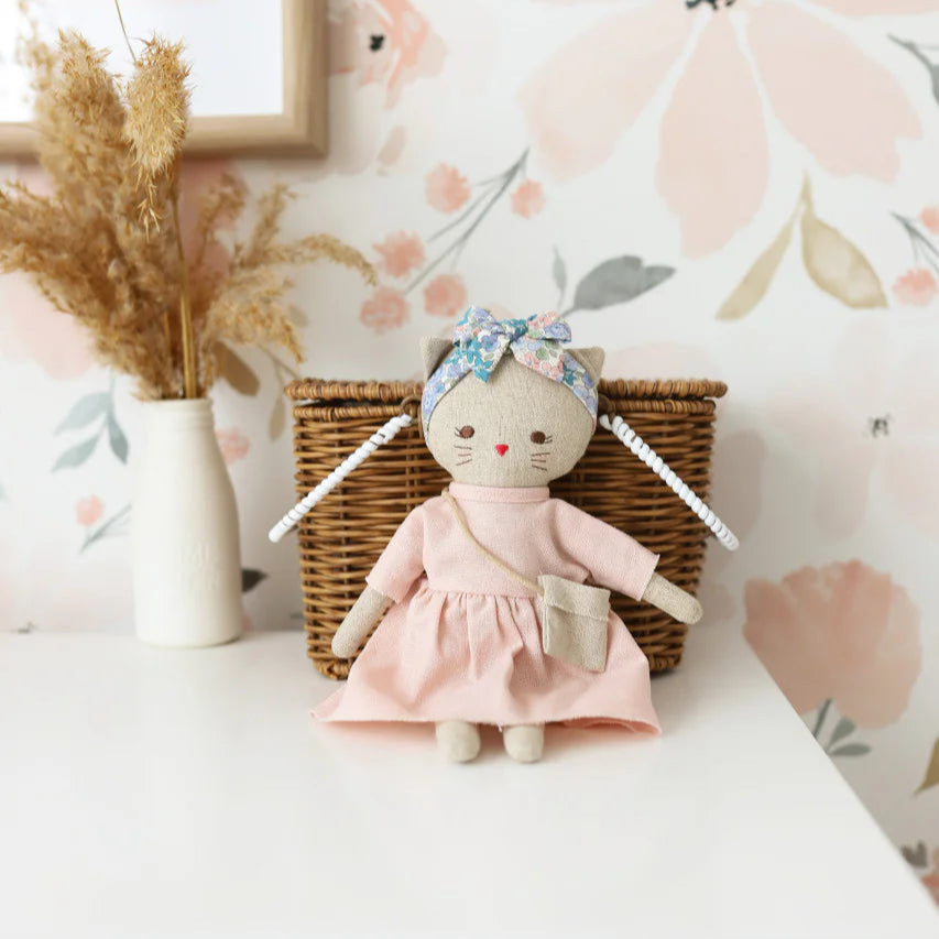 A cute mini kitten doll. Lilly Kitty features a sweet pink linen dress & floral headband. She is ready for a playdate with her adorable little bag.