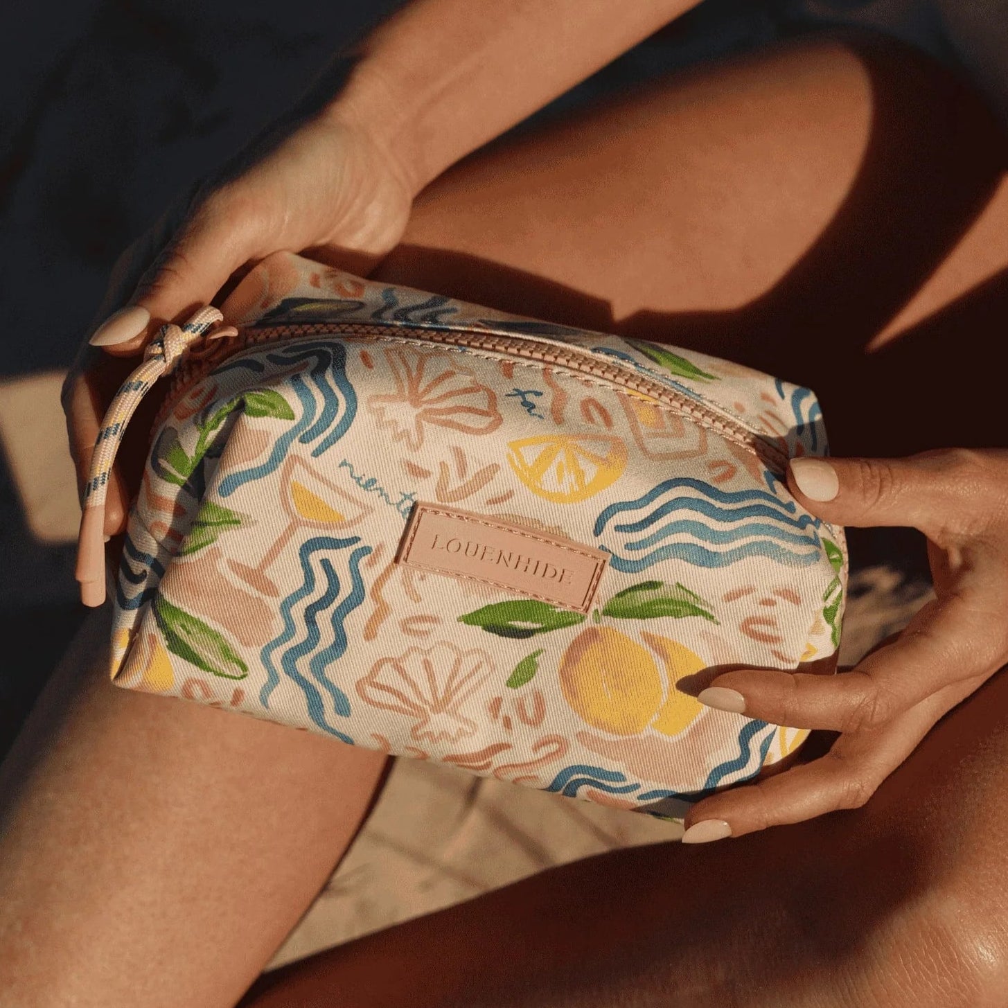 The Cass Deller x Louenhide collaboration brings a playful twist to travel essentials with the Bambi Lemon Print Cosmetic Case, adorned in the artist’s Dolce Far Niente design. Crafted from soft cotton canvas and scattered with Amalfi-inspired lemons, Bambi is a cheerful companion that captures the carefree joy of sun-drenched summers and seaside escapes. Compact and lightweight, she’s designed for effortless organisation on the go. A secure zip opens to reveal a contrasting pink and white striped lining, a sweet detail that adds charm to your daily beauty ritual. Finished with a colourful rope puller, Bambi is perfect for keeping your must-have products close at hand, whether you’re at home, packing for a weekend away, or chasing golden hour adventures.