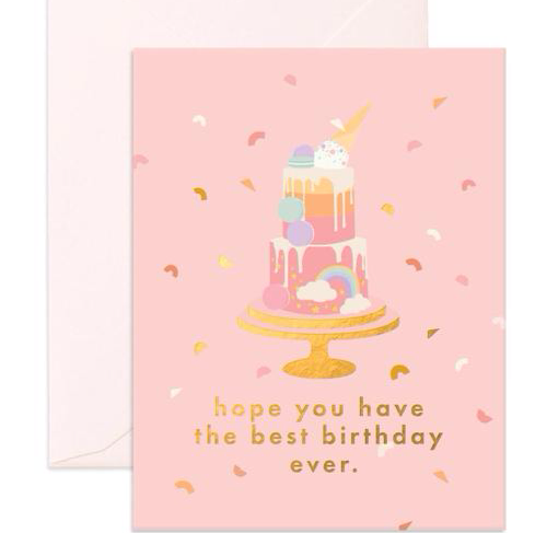 Gold foiled, pale pink greeting card with beautiful birthday cake illustration. Blank inside. Gold lettering "Hope you have the best birthday ever".