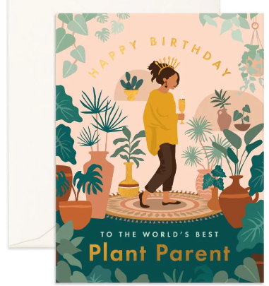 Gold-foiled, Happy Birthday greeting card. Gorgeous illustration. Blank inside. Gold lettering "To The World's Best Plant Parent"