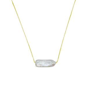 A beautiful, delicate Biwa pearl on a dainty 925 Sterling Silver, 18k Gold plated chain. A beautiful classic piece. The pearl is around 1.5cm in length and 0.5cm in width.