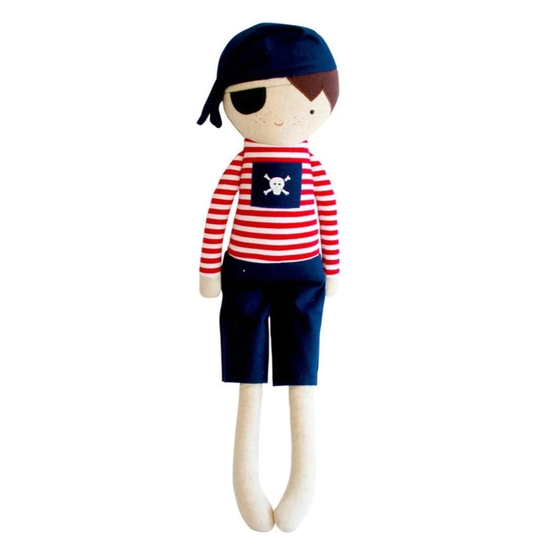 This oh-so cute linen Pirate Boy is a a beautiful and thoughtful gift, all individually handcrafted by artisans. Made out of linen and cotton, these dolls are super soft to touch and made to last. Pirate Boy is so adorable with his cute embroidered eye patch, pirate patch and nautical themed outfit. Pirate Boy has a rattle inside.