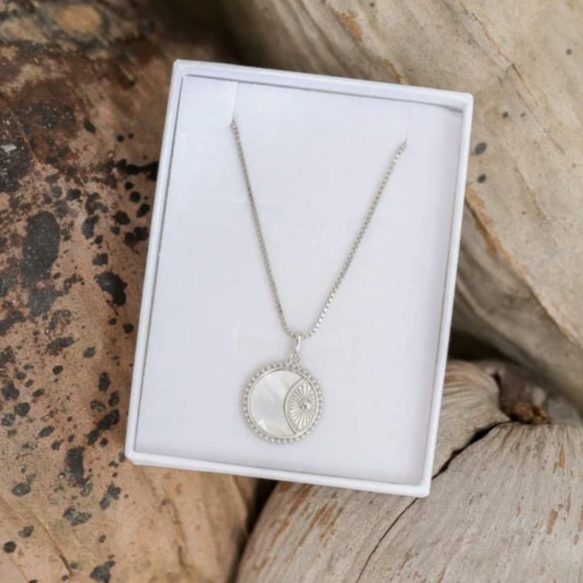 A symbol of exponential growth and rapid change, the solar eclipse reminds us to focus on personal desires, and goals. This stunning necklace features a partial eclipse made of mother of pearl inlaid alongside a sun.