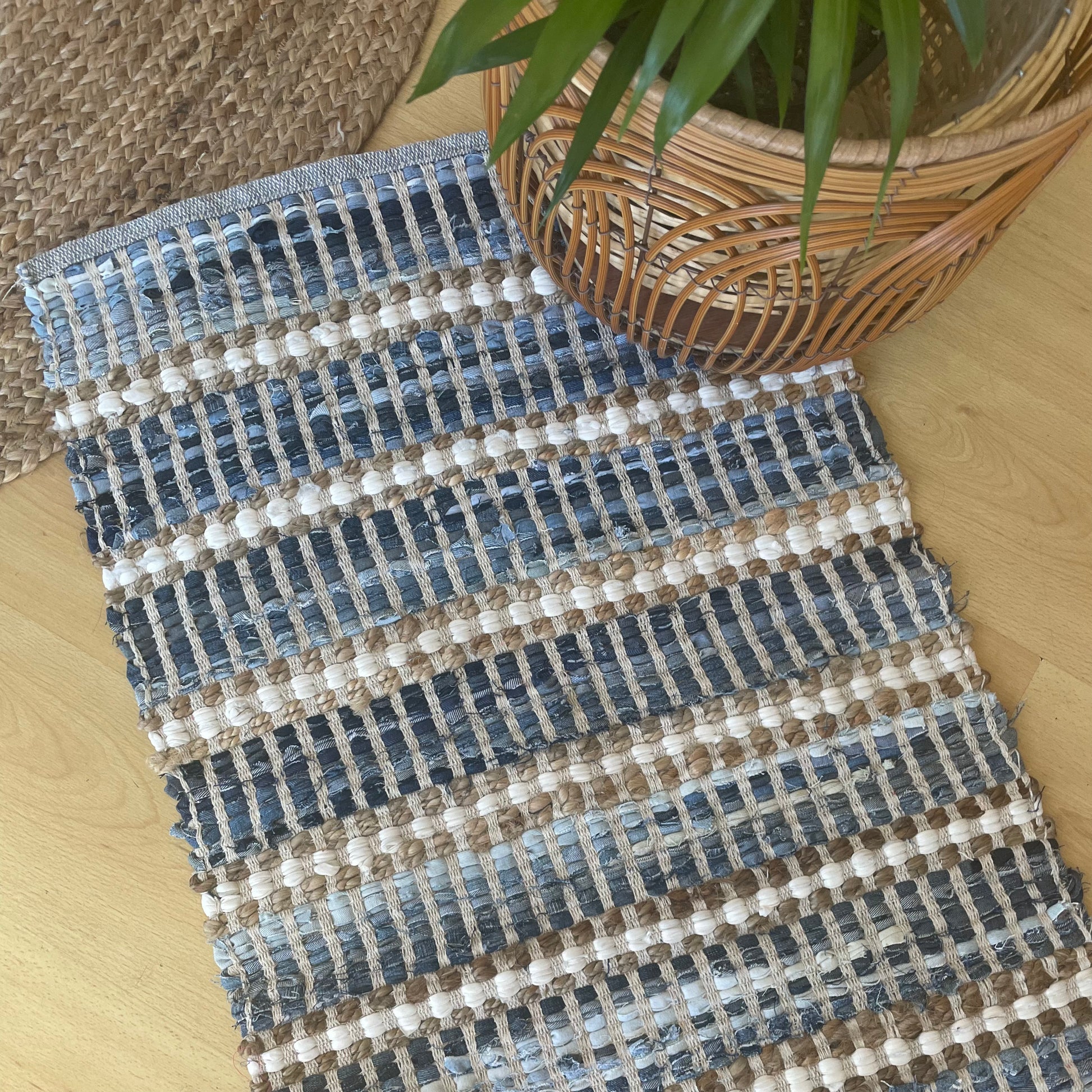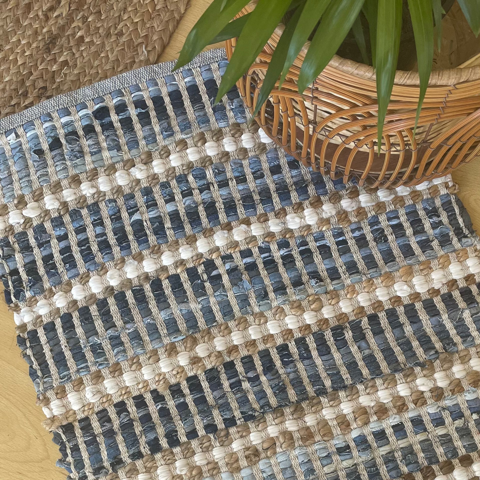 This recycled denim cotton and jute mat is an on trend addition to your home. It matches delightfully in a costal or Hamptons home.