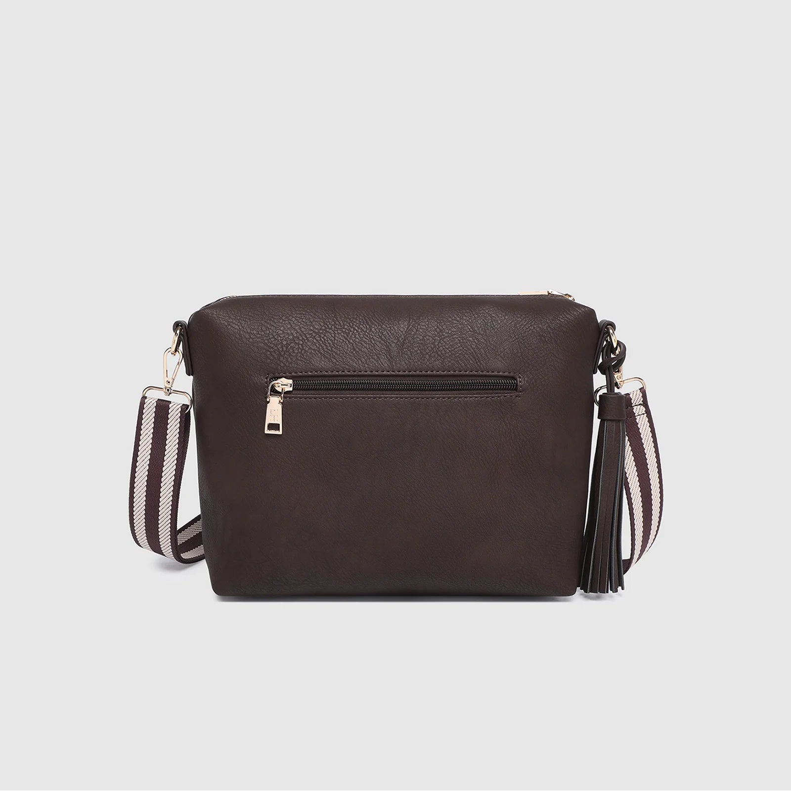 The Daisy Chocolate Stripe Crossbody Bag is a best-selling favourite, loved for her buttery soft, slouchy silhouette and effortless versatility. Designed with both style and function in mind, she features two slip pockets, one internal zip pocket, and a back zip pocket to keep essentials secure and organised. Finished with light gold hardware and a playful tassel, Daisy includes two strap options - a sporty, adjustable webbing strap for a relaxed edge, or a matching vegan leather strap for a polished finish. Whether worn casually or styled with sophistication, Daisy adapts effortlessly to your mood and your moment.