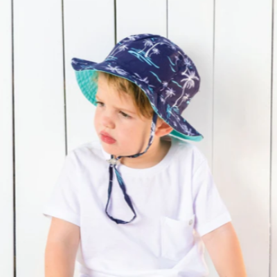 Gorgeous palm tree design for the little island lover in your family. Wide brim to provide exceptional sun safety, in a fantastic quick dry material. Tie up under the chin for extra security. Fun aqua colour on the underside for contrast.