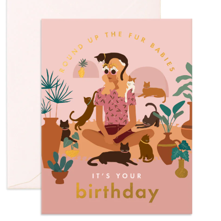 Fun greeting card to wish happy birthday to your cat-inspired loved one a happy birthday. Gold-foiled writing on the front "Round up the fur babies, it's your birthday". Blank inside.