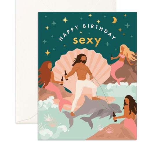 Gold foiled, deep green "Happy Birthday Sexy" greeting card. Gorgeous Poseidon illustration. Blank inside. Gold lettering "Happy Birthday Sexy".