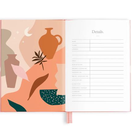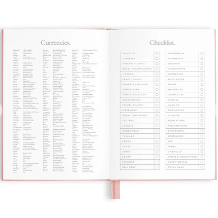 140 pages. Rose-gold foil stamped dusty rose linen cover and grosgrain ribbon. 2mm foil stamped hard cover, lay-flat binding. Patterned end pages and premium 100gsm FCS-certified acid-free paper.