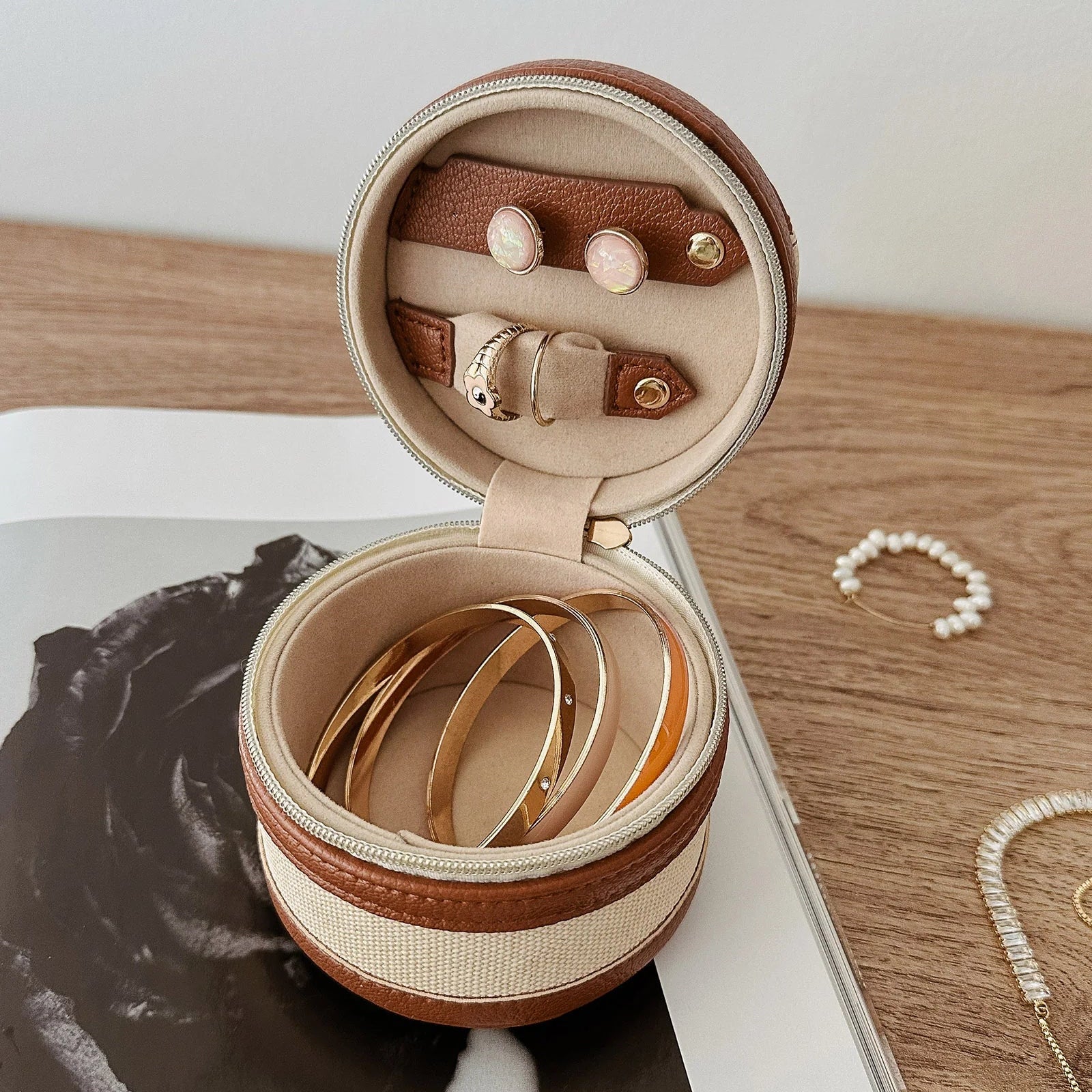 The Loz Canvas Tan Jewellery Box is a travel jewellery box designed for effortless organisation and timeless style. Thoughtfully made from smooth vegan leather and natural canvas, this portable jewellery organiser with a zipper blends functionality with a refined aesthetic. Inside, dedicated earring and necklace bands keep your pieces secure and tangle-free, whether you're heading off for a weekend escape or storing your favourites at home. Finished with a sleek silhouette and elevated by a subtle gold logo, the Loz Canvas Tan Jewellery Box is your go-to companion for storing sparkle on the move.