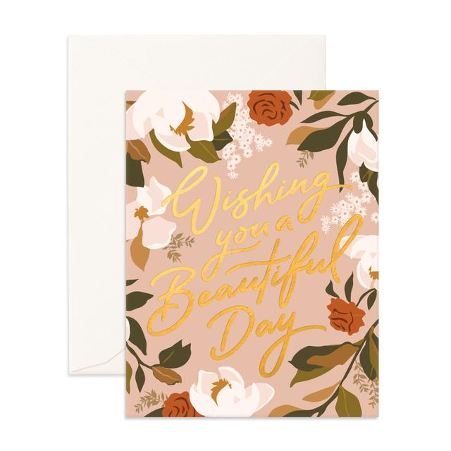 Gold foiled, greeting card with beautiful floral magnolia illustration. Blank inside. Gold lettering "Wishing you a beautiful day".
