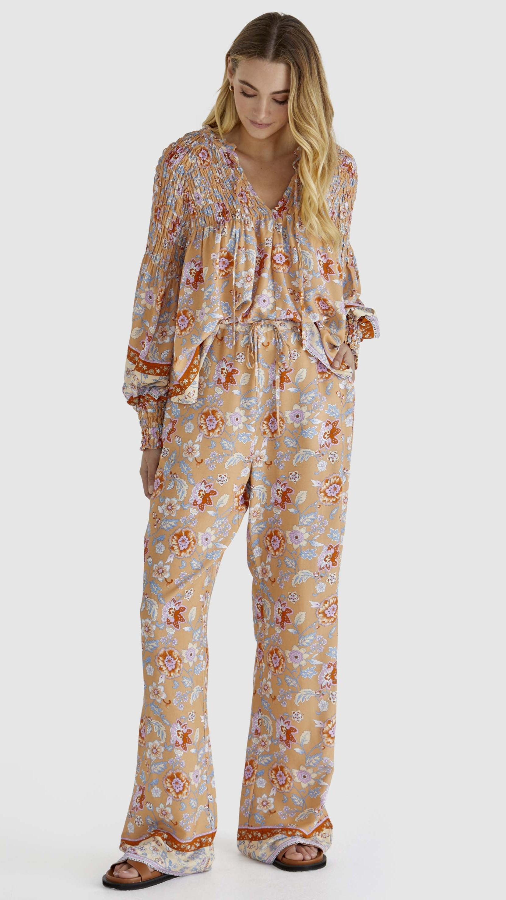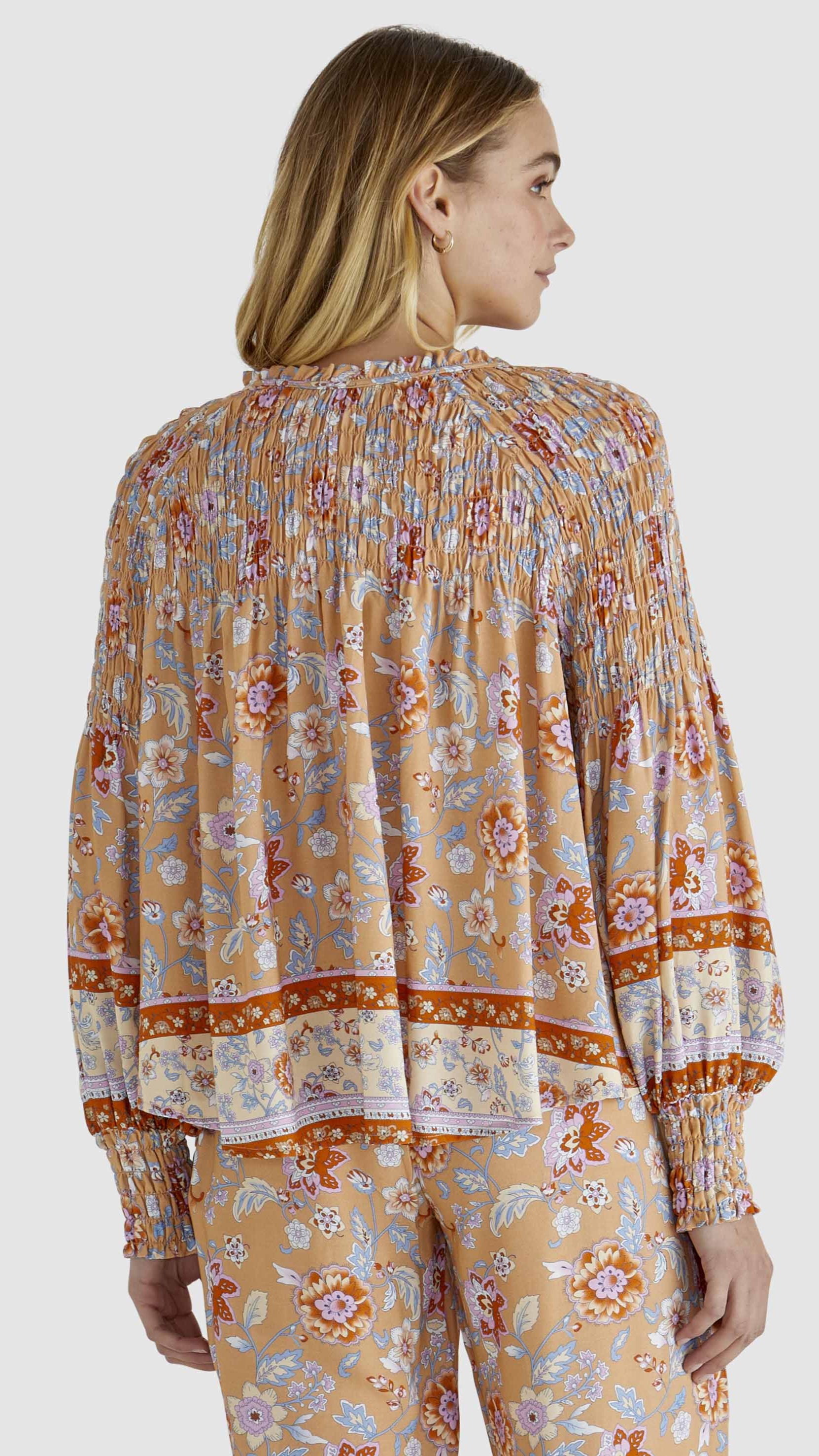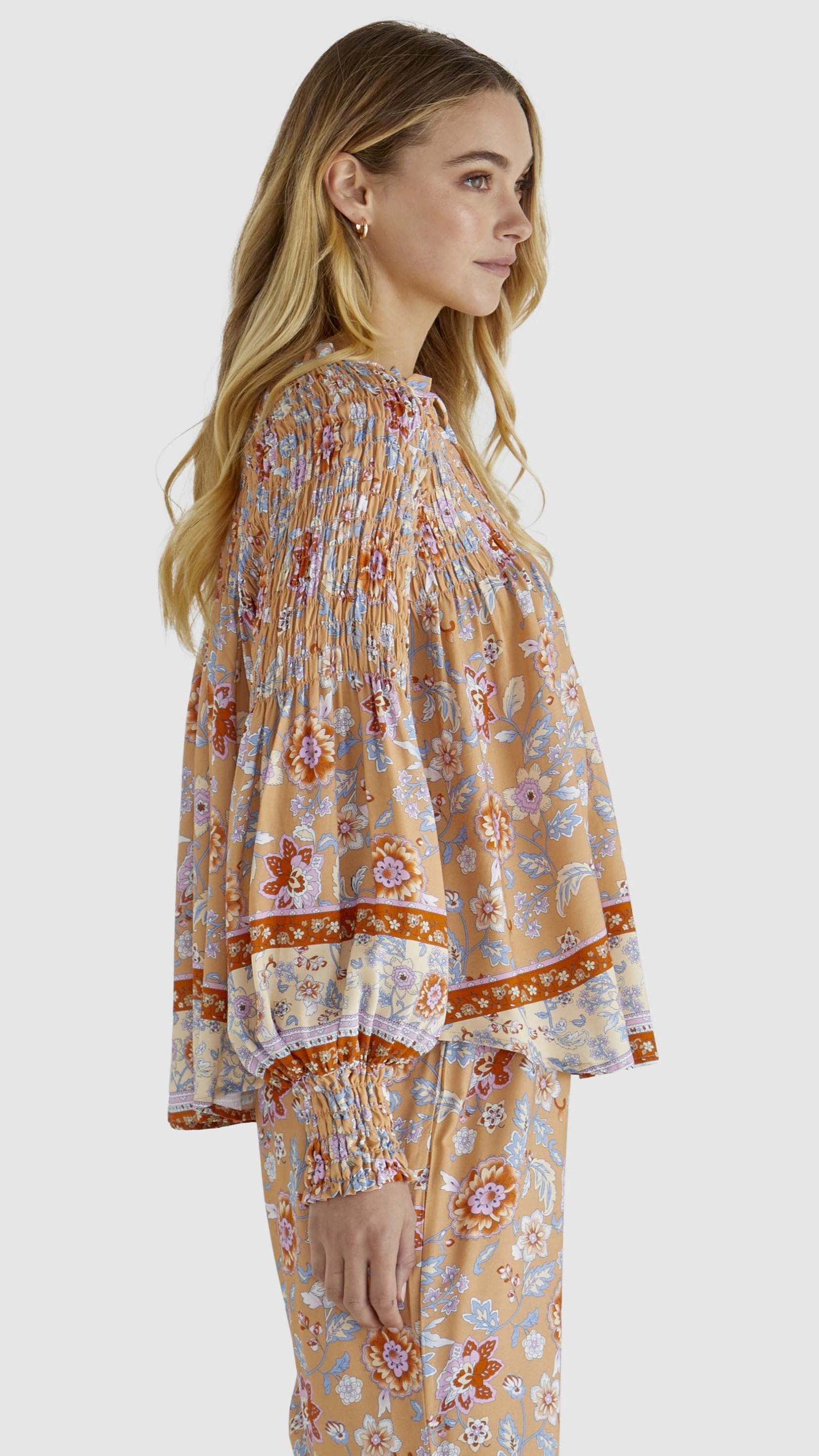The Margie Top combines relaxed sophistication with playful details. Featuring a curved hem and V-neck with a chic neck tie, this top can be worn both ways for versatile styling. The delicate shirring on the shoulders and sleeves adds a feminine touch, making it an effortlessly stylish choice for any occasion.