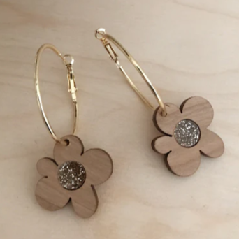 Moon Flower Hoops - Cherrywood & Gold Glitter