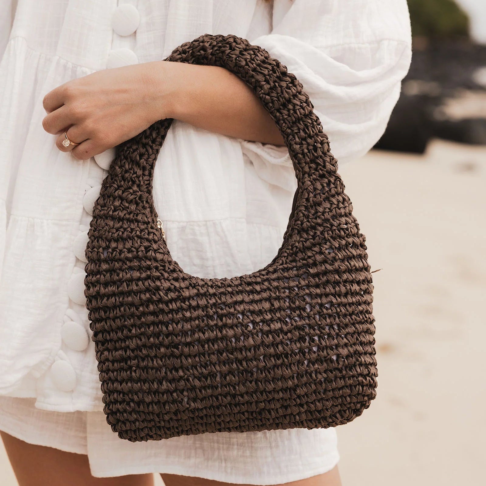 The Nellie Raffia Shoulder Bag captures the carefree charm of a coastal summer, blending natural texture with refined design. This lightweight woven handbag is crafted from natural raffia in a softly sculpted crescent silhouette - made for breezy days and golden hour strolls. Light gold hardware adds a polished finish, while a secure zip closure keeps your essentials safe from brunch to beach club. Designed to sit comfortably under the arm, this raffia handbag brings a touch of laid-back luxury to any look. Whether paired with a linen set or a flowing sundress, Nellie Raffia is the perfect companion for long lunches, market mornings, and everything in between.