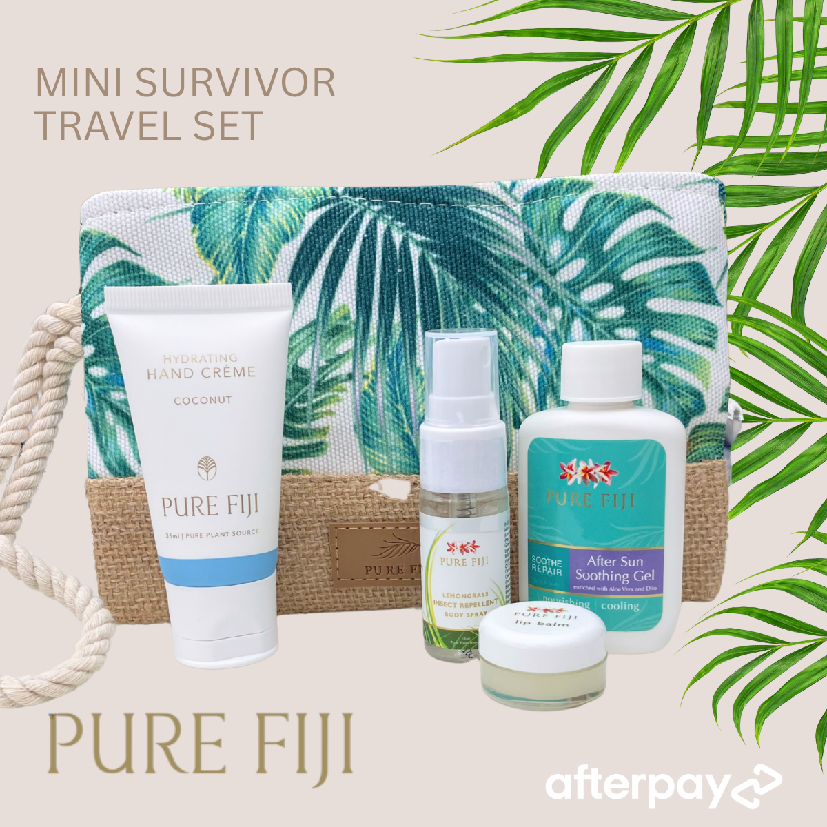 In a stunning tropical palm zippered pouch, you have all your travel survival minis ready for your next getaway. You know its going to be good because it is filled with Pure Fiji Minis. It's your Survival Set.