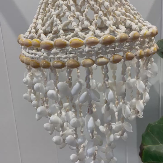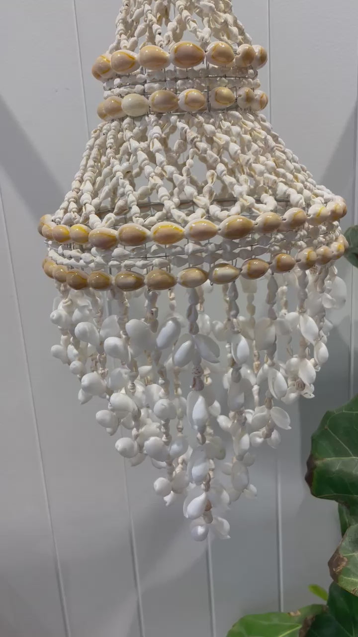 Bring the soothing vibes of the beach to your home with our Lailai Handmade White Bubble Shell Chandelier. This stunning decor piece is crafted from a collection of beautiful white bubble shells, arranged in a graceful curved shape that captures the essence of coastal elegance. Perfect for adding a touch of boho, Hamptons, or coastal style to any room, this chandelier will transport you to the shore every time you look at it.