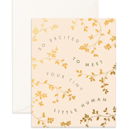 Gold foiled, "So Excited To Meet Your Tiny Human" greeting card. This is a lovely greeting card to welcome a new arrival with love.