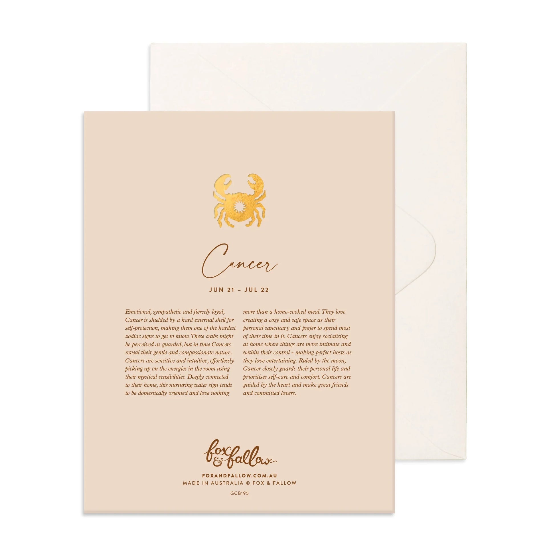 Gold foiled, zodiac greeting card. Cancer "Emotional, sympathetic and truly loyal" June 21st to July 22nd. Blank inside. Description of the starsign included.